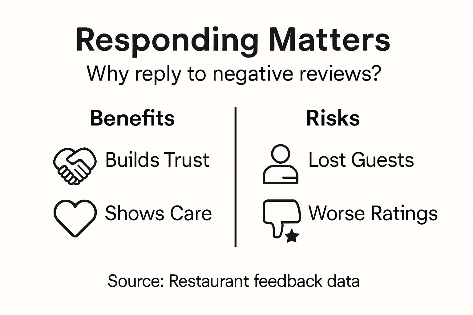 PointDetailsNegative Reviews as OpportunitiesNegative reviews offer valuable insights into operational weaknesses that can enhance customer satisfaction.Importance of EngagementActively responding to negative feedback can build customer loyalty and trust, transforming criticisms into opportunities for improvement.Psychological Factors MatterSpeed, empathy, and professionalism in responses significantly influence customer perception and can enhance a restaurant's reputation.Risks of Ignoring FeedbackIgnoring negative reviews can lead to severe reputation damage and financial consequences, making timely response essential for success.